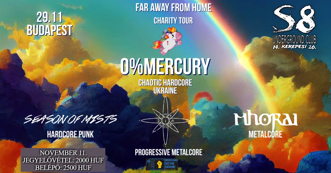 Az ukrán 0%Mercury zenekar kezdeményezésére létrejött esemény egy tartalmas, zeneileg változatos programlehetőségnek ígérkezik. A chaotic hardcore-banda vendégeként a Mhorai (deathcore/ melodic death), az Idol Of A Broken Mind (progresszív metalcore) és a Season of Mists (skramz/ hardcore punk) trió fog színpadra állni. A rendezvény teljes jegybevételét a Musicians Defend Ukraine Foundation kapja majd kézhez. Az alapítvány célja az, hogy a háború sújtotta ország nehéz helyzetben lévő zenekarait és zenészeit támogassák. Ha nem ugranátok fejest az ismeretlenbe, akkor a 0%Mercury-től a Reflection, a Mhorai-tól a Ephemerida, míg az Idol Of a Broken Mindtól a Gyilkos Hajlam lehet segítségetekre a felfedezésben, de a Season of Mists első új felállásos produkciójával is megismerkedhettek. Ne feledjétek: november 29-én jótékonysági koncert a budapesti S8-ban! Az este részletes programjáról és a belépőkről ide kattintva tudhattok meg többet.